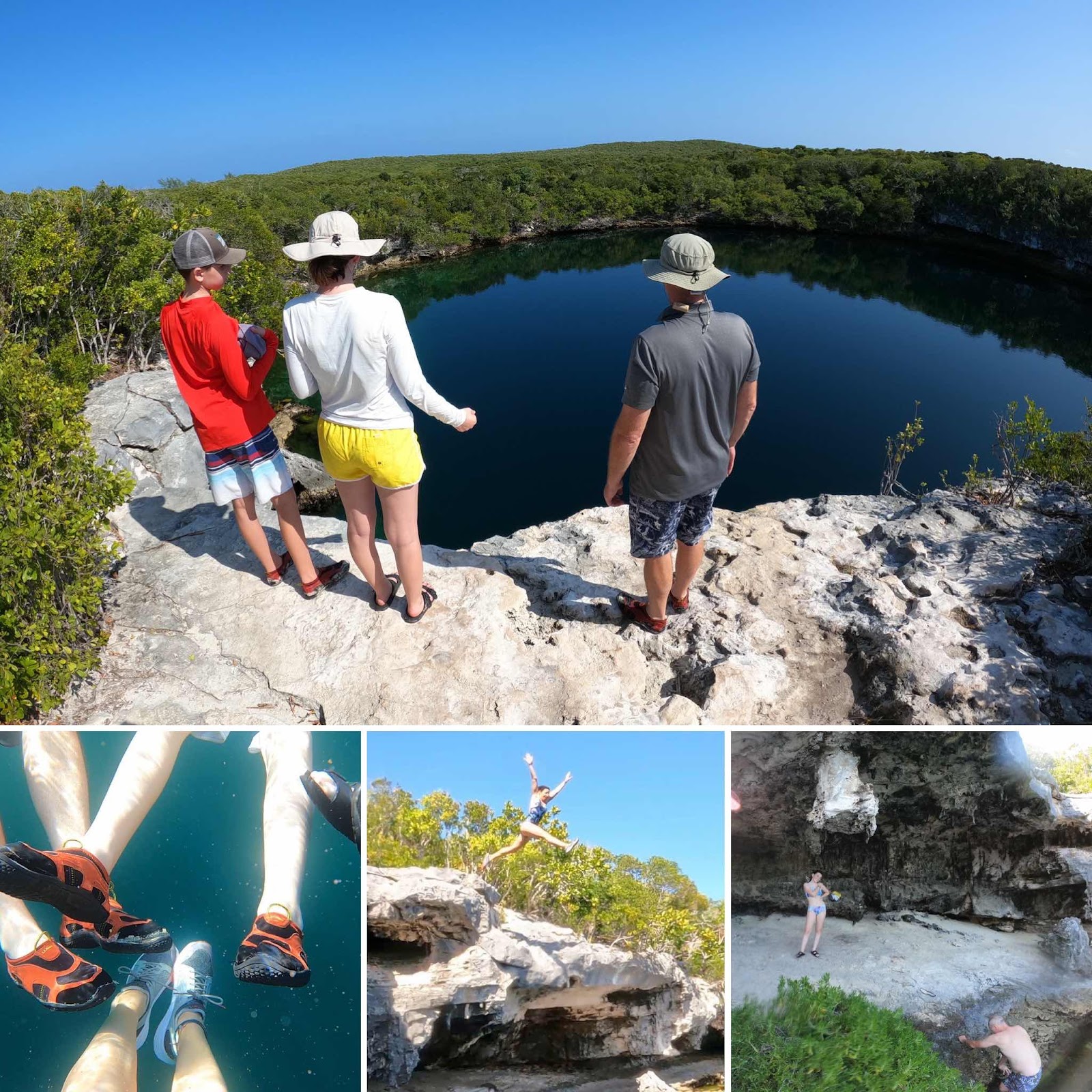 After a quick lunch we set up the solar oven to heat up our Super Bowl Sunday dinner of queso and bean dip and took off in the dink to hit the blue hole. The kids quickly found the trail and within minutes we were overlooking the 600-foot wide hole from a cliff 20 feet up. And we were the only ones there! It was so quiet. The only sounds were our feet on the rocks and a few birds. But enough peace...it was time to jump! Trent kicked things off, followed by Frank, Katreina, and finally me! That first jump was kind of scary, but the water felt great and I went back a few more times. Love it there!